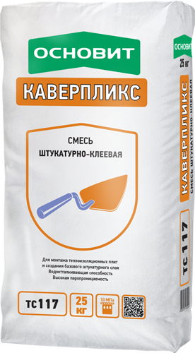 Штукатурно-клеевая смесь ОСНОВИТ КАВЕРПЛИКС ТС117 предназначена для монтажа пенополистирольных и минераловатных плит, создания армированного базового штукатурного слоя.