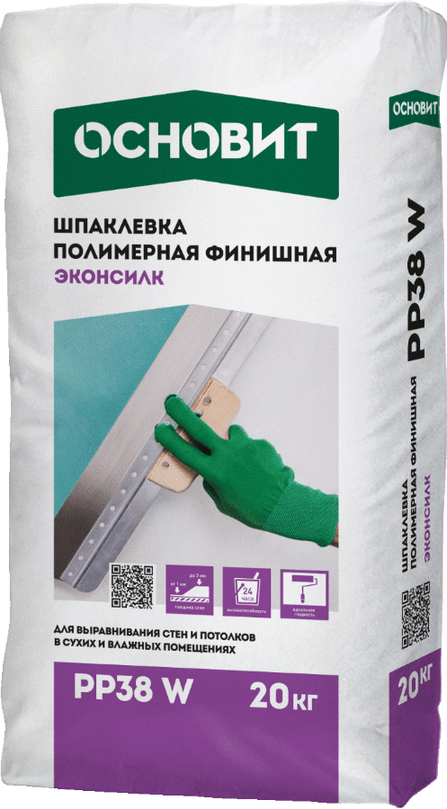 Шпаклевка ОСНОВИТ Эконсилк PP38 W предназначена для выравнивания стен и потолков в сухих и влажных помещениях.